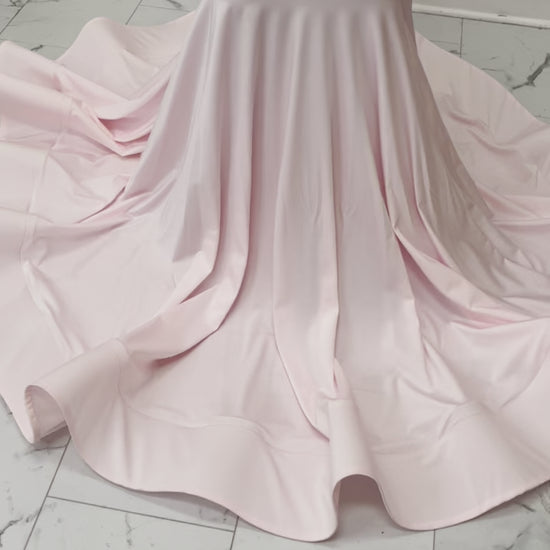 Pink Luxury Crystal-Embellished Bodice over a skin-tone illusion mesh on a pink stretch spandex mermaid train dress. Open Back Concept.